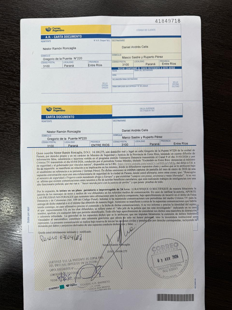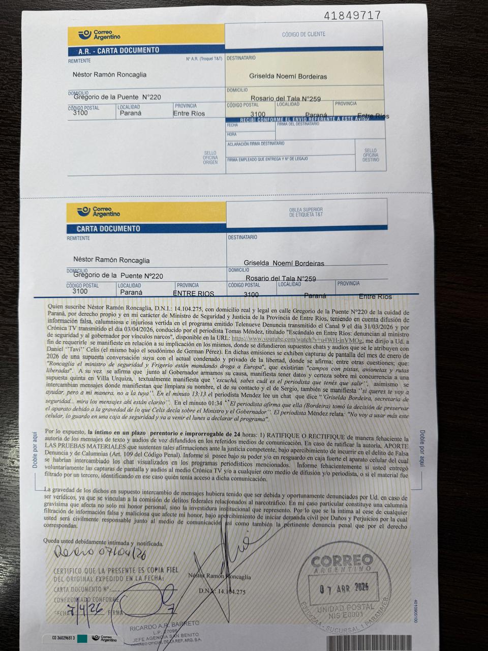 Ante la difusión de estas versiones, el ministro decidió no dejar pasar el hecho y activó el mecanismo de la carta documento. La intimación es clara: exige que ambos aclaren bajo apercibimiento legal si efectivamente pronunciaron esas acusaciones y, en caso afirmativo, que presenten las pruebas correspondientes.